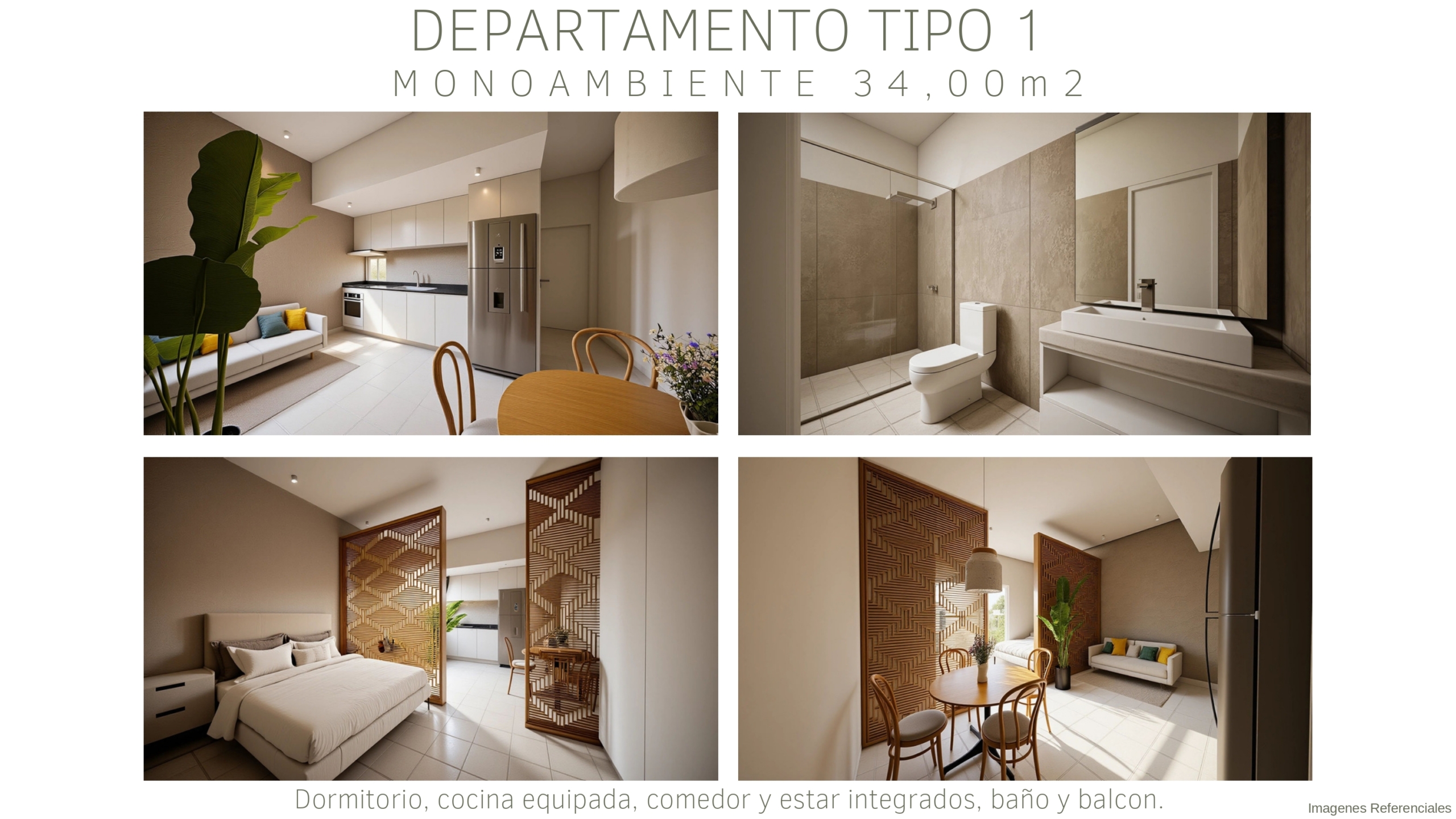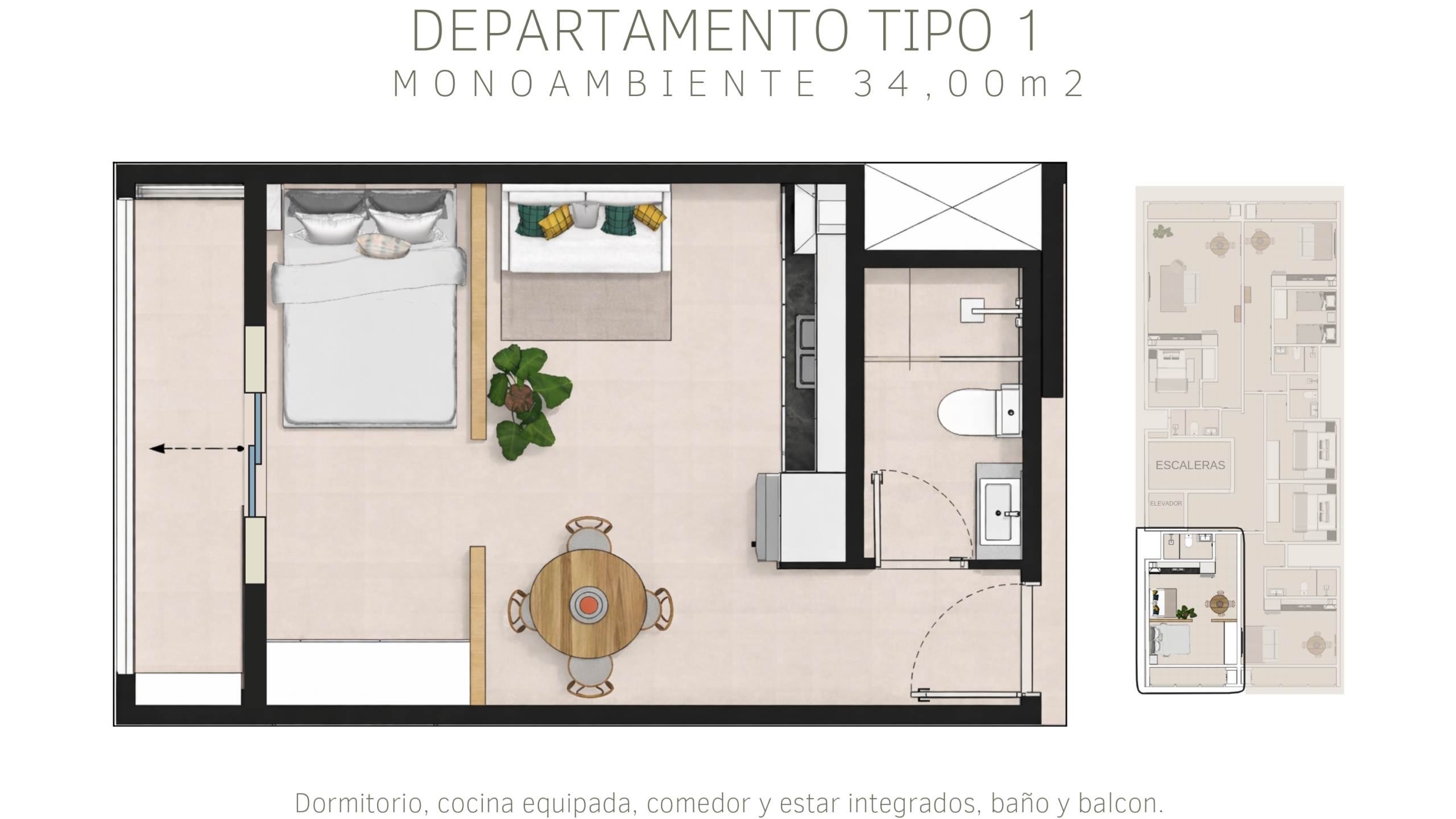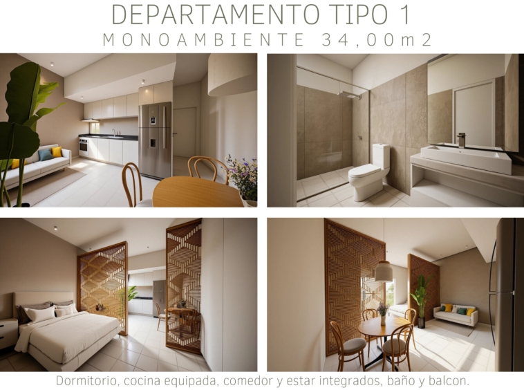 Tipología A: departamentos monoambientes de 34m²