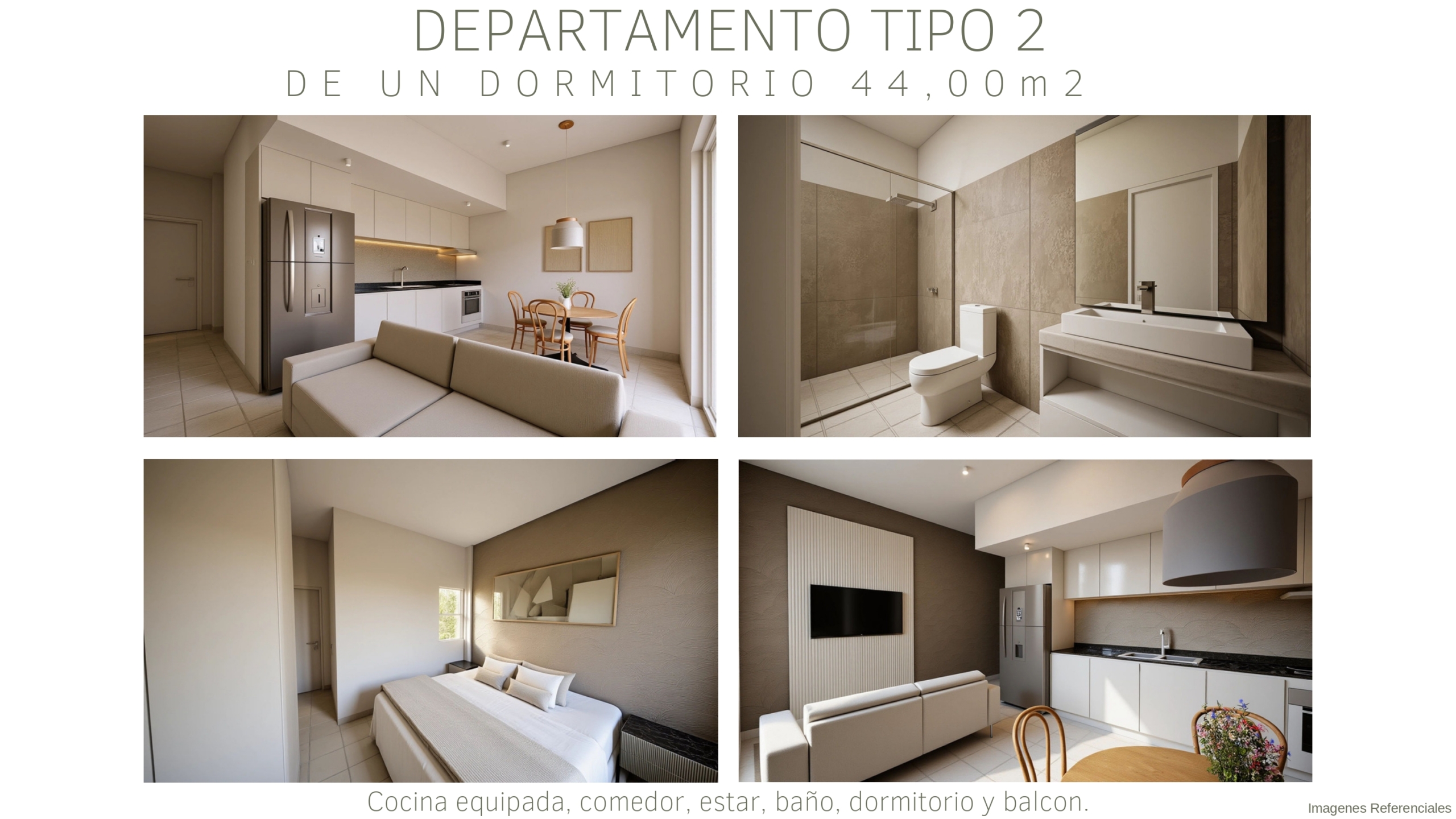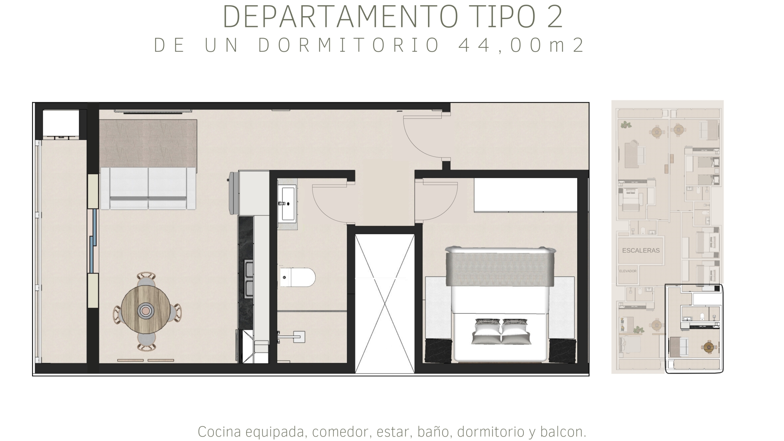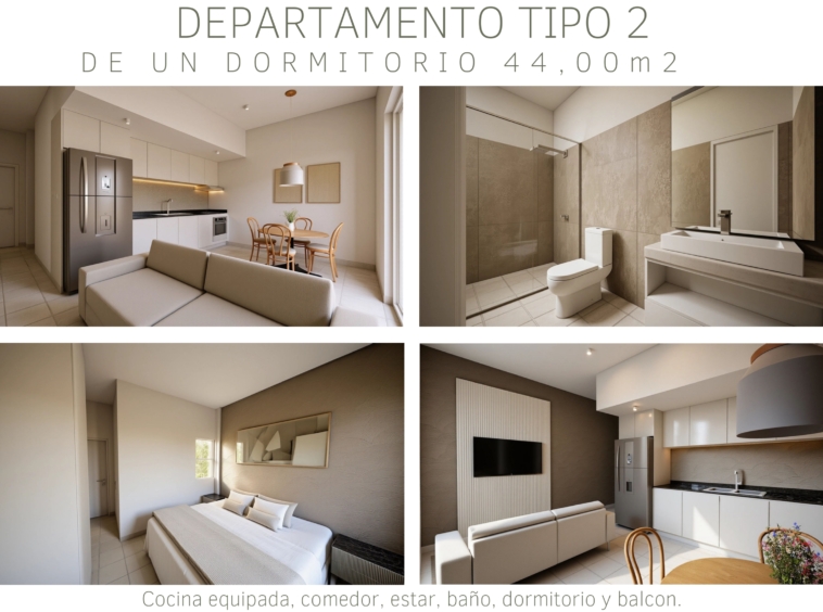 Tipología B: departamentos de 1 dormitorio de 44m²